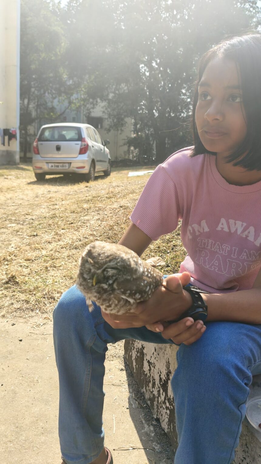 विद्या भारती चिन्मिया विद्यालय की कक्षा सात की छात्रा शन्वी किरण महतो (12 वर्ष) रविवार सुबह अपने घर के पास भुवनेश्वरी मंदिर के समीप खेल रही थी। इसी दौरान उसकी नजर कुछ कुत्तों की असामान्य हरकतों पर पड़ी। पास जाकर देखने पर उसने पाया कि कुत्ते एक नन्हे उल्लू को घेरकर उस पर हमला करने की कोशिश कर रहे हैं।