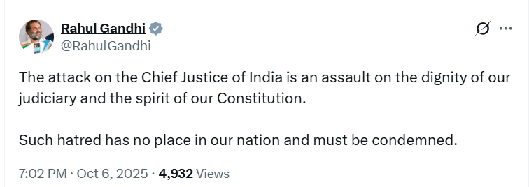 कांग्रेस सांसद और नेता प्रतिपक्ष राहुल गांधी ने कहा – “मुख्य न्यायाधीश पर हमला केवल न्यायपालिका पर नहीं, बल्कि संविधान की आत्मा पर भी चोट है। नफ़रत की इस राजनीति की कोई जगह हमारे देश में नहीं हो सकती।”