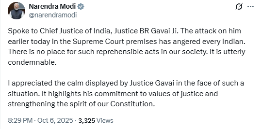 प्रधानमंत्री नरेंद्र मोदी ने इस घटना की कड़ी निंदा करते हुए कहा कि “यह निंदनीय कृत्य हर भारतीय को आक्रोशित करता है। हमारी समाज व्यवस्था में ऐसे कृत्यों की कोई जगह नहीं है।” उन्होंने मुख्य न्यायाधीश की संयम और शांतिपूर्ण प्रतिक्रिया की सराहना की।