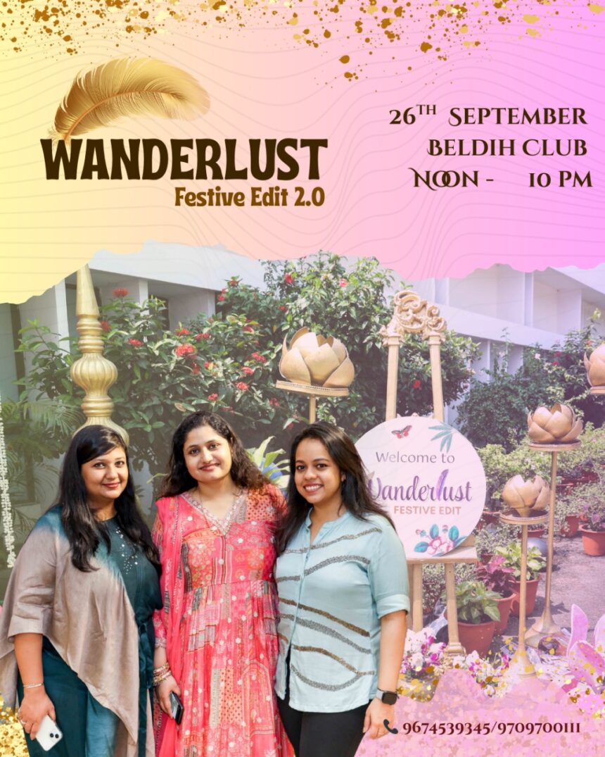 जमशेदपुर : बहुप्रतीक्षित वांडरलस्ट फेस्टिव एडिट 2.0 का आयोजन 26 सितम्बर 2025 को बेलडीह क्लब में दोपहर 12 बजे से किया जाएगा। यह कार्यक्रम संस्कृति, भोजन और उत्सवी शॉपिंग का अनोखा संगम होगा, जिसमें कोलकाता और जमशेदपुर से आए विशेष स्टॉल शामिल होंगे। यह आयोजन तीन महिला उद्यमियों – श्रद्धा अग्रवाल, पूजा अग्रवाल और उर्जा अग्रवाल – द्वारा किया जा रहा है, जिनका उद्देश्य स्थानीय व्यवसायों, महिला उद्यमियों और रचनात्मक उद्यमों को बढ़ावा देना है।